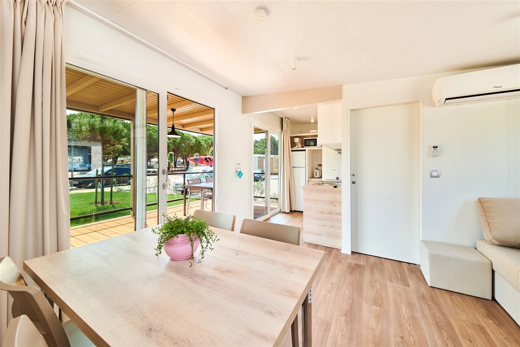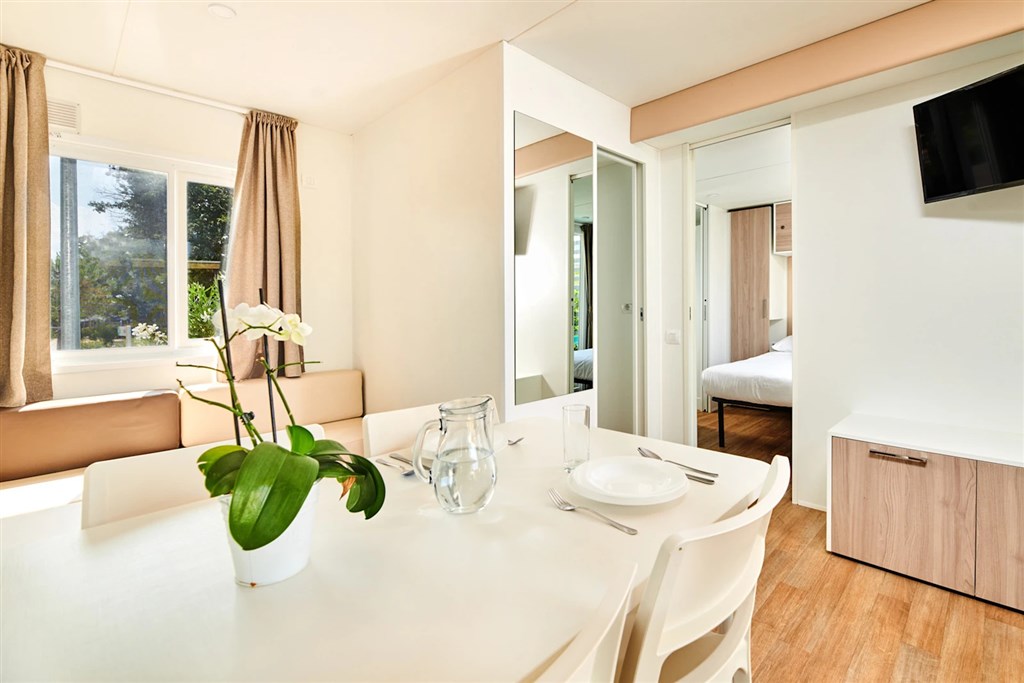 SMC4B2-MH 4+2 Superior - 32-34 m2 - mobilní domek až pro 6 osob, dvě dvoulůžkové ložnice (jedná s manželskou postelí, druhá s oddělenými lůžky, denní místnost s rozkládacím gaučem pro dvě děti do 12 let, 2x koupelna se sprchou a WC, vybavený kuchyňský kout (varná deska, lednice, mikrovlnná trouba, myčka na nádobí, příslušenství na přípravu kávy a čaje), klimatizace, SAT TV, sejf, Wi-Fi (bez garance rychlosti připojení), terasa se stolem a židlemi.