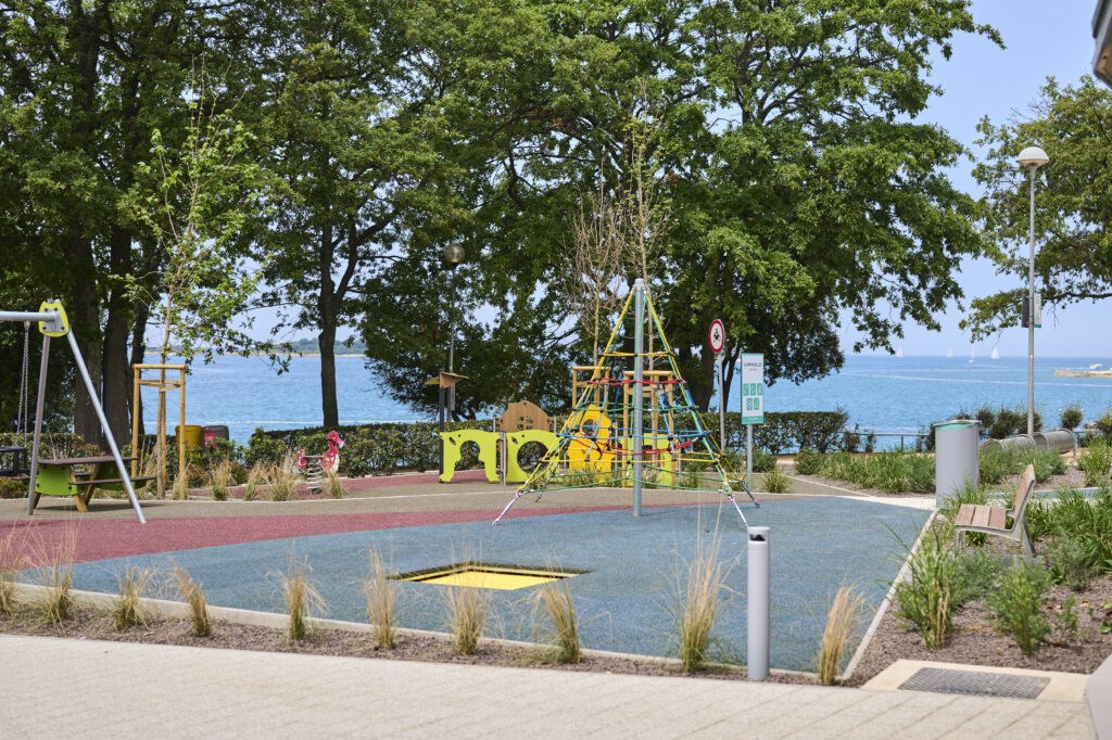betonová pláž, kamenitá betonová a přírodní pláž, cca 100-200m (dle umístění mobilního domku), sprchy a převlékáci kabinky, lehátka a slunečníky za poplatek