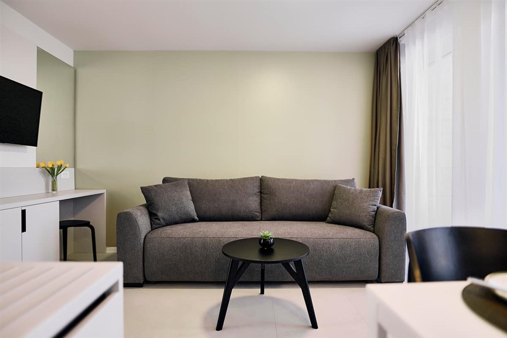 Studio 2(+2), balkon - 32m2 - dvoulůžkový pokoj s manželskou postelí (160x200 cm) s denní místností s rozkládacím gaučem pro dvě osoby (160x200 cm), balkon s posezením