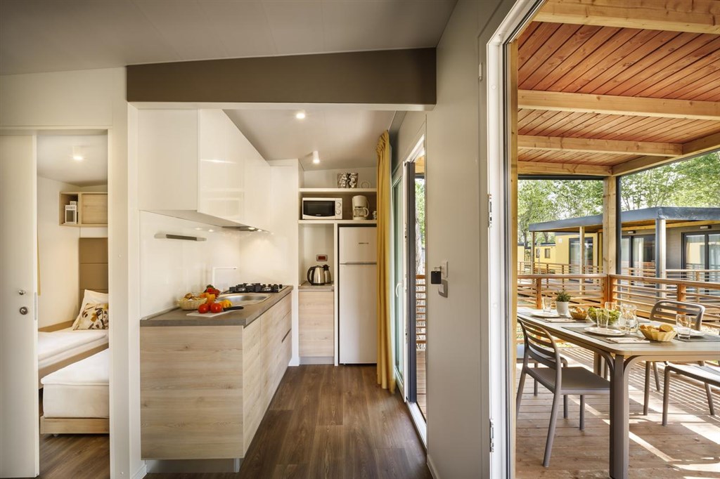 MH Lopar Garden Home 4(+2) - MHLPR - cca 34 m2 - mobilní domek až pro 6 osob, krytá terasa se zahradním nábytkem, 1x ložnice s manželskou postelí, 1x ložnice se 2 samostatnými lůžky, obývací pokoj s rozkládací pohovkou pro děti do 12 let, vybavený kuchyňský kout (sporák, mikrovlnná trouba, lednice), klimatizace, sprcha, WC, SAT TV.
