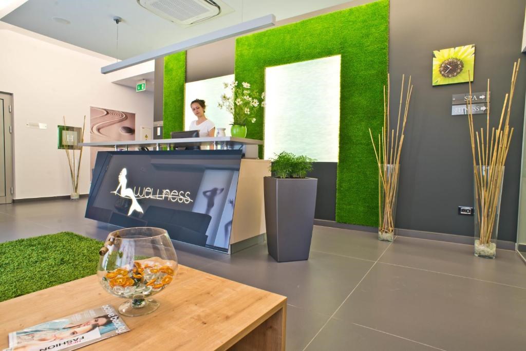 v areálu: recepce, restaurace, bar, dětské hřiště, minigolf, tenisové kurty, wellness, fitness centrum a další.