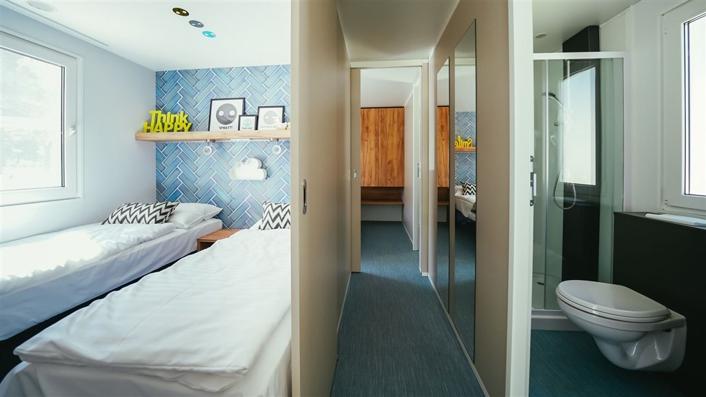 MH 4+1 - Camping Family Home - 40 m2 MH je vybaven 2 ložnicemi (1 manželská postel a kombinace oddělených lůžek), kuchyňským koutem, rozkládacím gaučem vhodným pro 1 dítě a 2 samostatnými koupelnami a venkovní terasou.