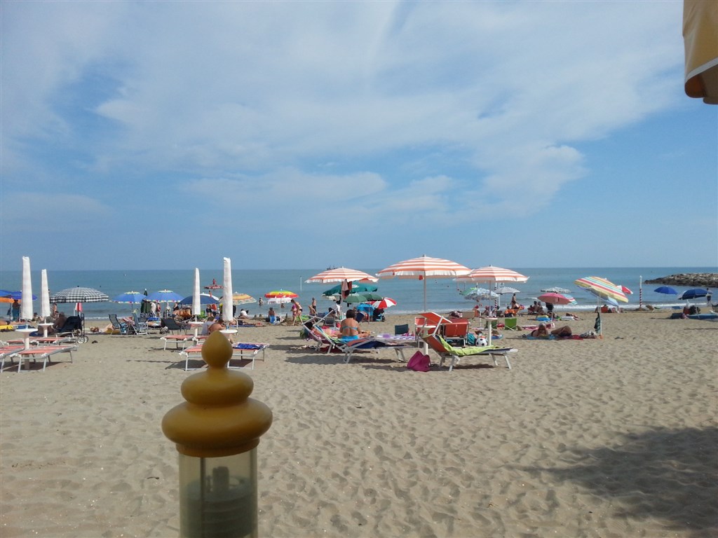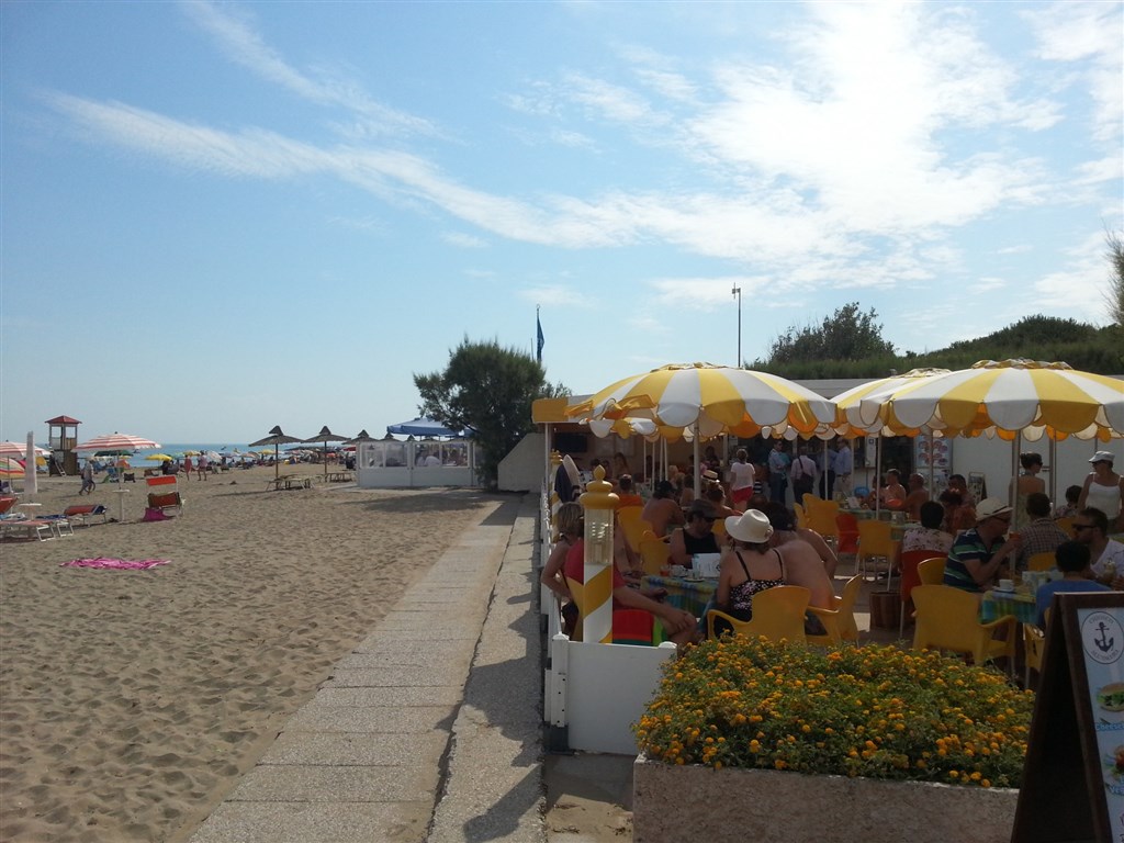 jemná písečná pláž, cca 100 m, lehátka a slunečníky za poplatek, plážový bar