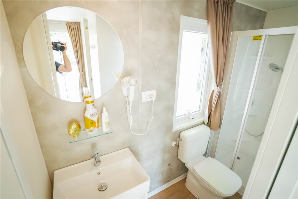 Mobilní domky jsou dále vybaveny: koupelna se sprchou a WC, SAT TV, klimatizace (za poplatek), plně vybavený kuchyňský kout (lednice s mrazákem , čtyřplotýnkový sporák a dřez, vybavení pro vaření a stolování), WiFi, částečně zakrytá terasa se zahradním nábytkem (stůl se židlemi , dvě lehátka nebo polohovací křesla)