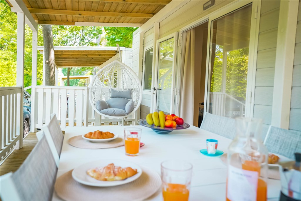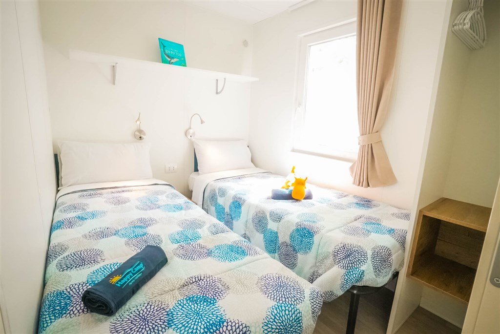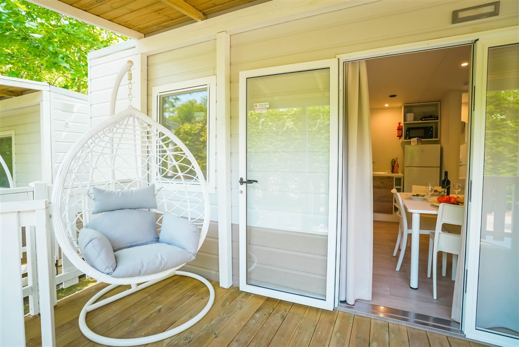 Moderní mobilní domky jsou dále vybaveny: sprcha a WC, SAT TV, klimatizace (za poplatek), plně vybavený kuchyňský kout (lednice s mrazákem , čtyřplotýnkový sporák a dřez, vybavení pro vaření a stolování), WiFi, částečně zakrytá terasa se zahradním nábytkem (stůl se židlemi , dvě lehátka nebo polohovací křesla a pohodlné závěsné křeslo).