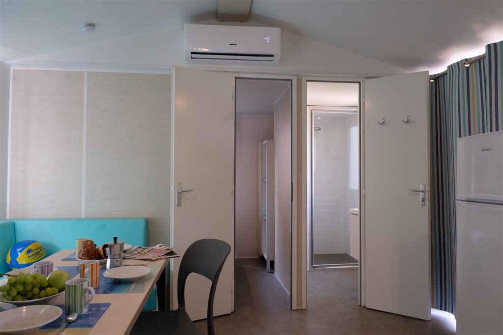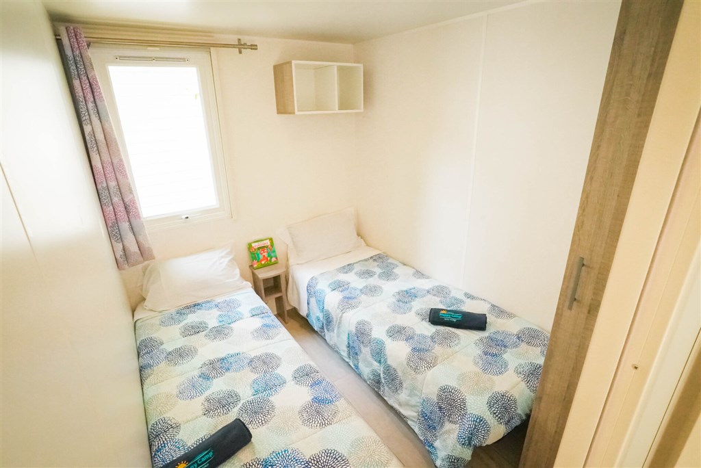 MH 4+1 Superior - 29 m2 - tři ložnice - ložnice s manželskou postelí ( 190x140 cm) a vlastní koupelnou vybavenou umyvadlem, zrcadlem, sprchou a WC, dvě ložnice, každá se dvěma samostatnými lůžky (190x70 cm), denní místnost a koupelnou se sprchou, WC, umyvadlem, zrcadlem a fénem. Mobilní domek nabízí maximální pohodlí pro ubytování