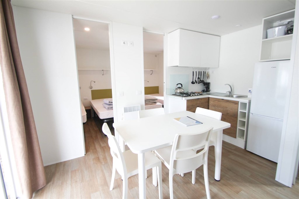 MH 4+1 Comfort - 24 m2 - jedna ložnice s manželskou postelí (190 x 140 cm) a druhá ložnice se dvěma samostatnými lůžky (190 x 70 cm) a další menší výsuvná postel, denní místnost s posezením, které může sloužit jako lůžko pro 5. osobu.