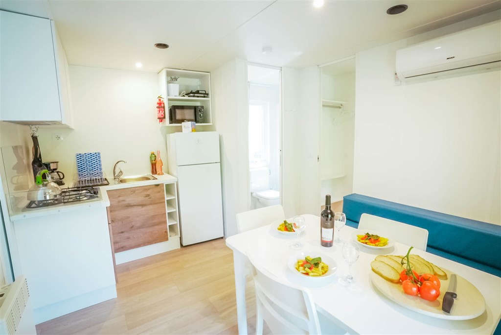 Mobilní domky jsou dále vybaveny: koupelna se sprchou a WC, SAT TV, klimatizace (za poplatek), plně vybavený kuchyňský kout (lednice s mrazákem , čtyřplotýnkový sporák (v MH Superior varná deska) a dřez, vybavení pro vaření a stolování), WiFi, částečně zakrytá terasa se zahradním nábytkem (stůl se židlemi , dvě lehátka nebo polohovací křesla)
