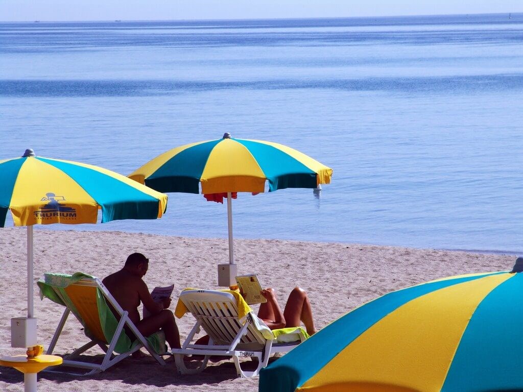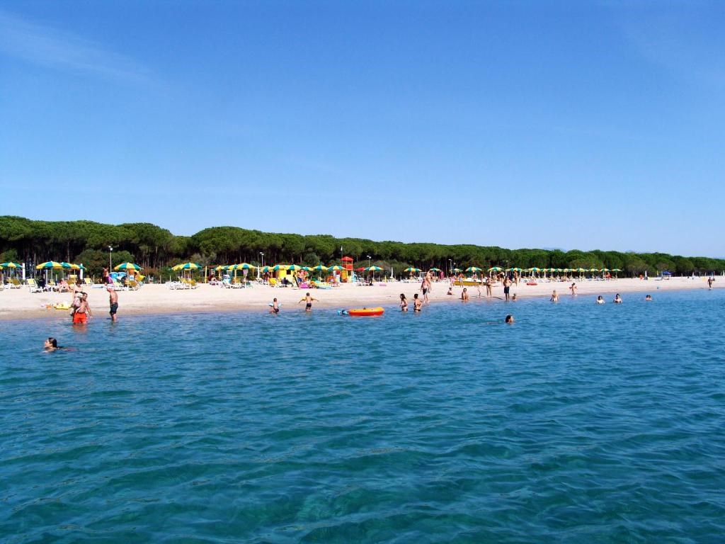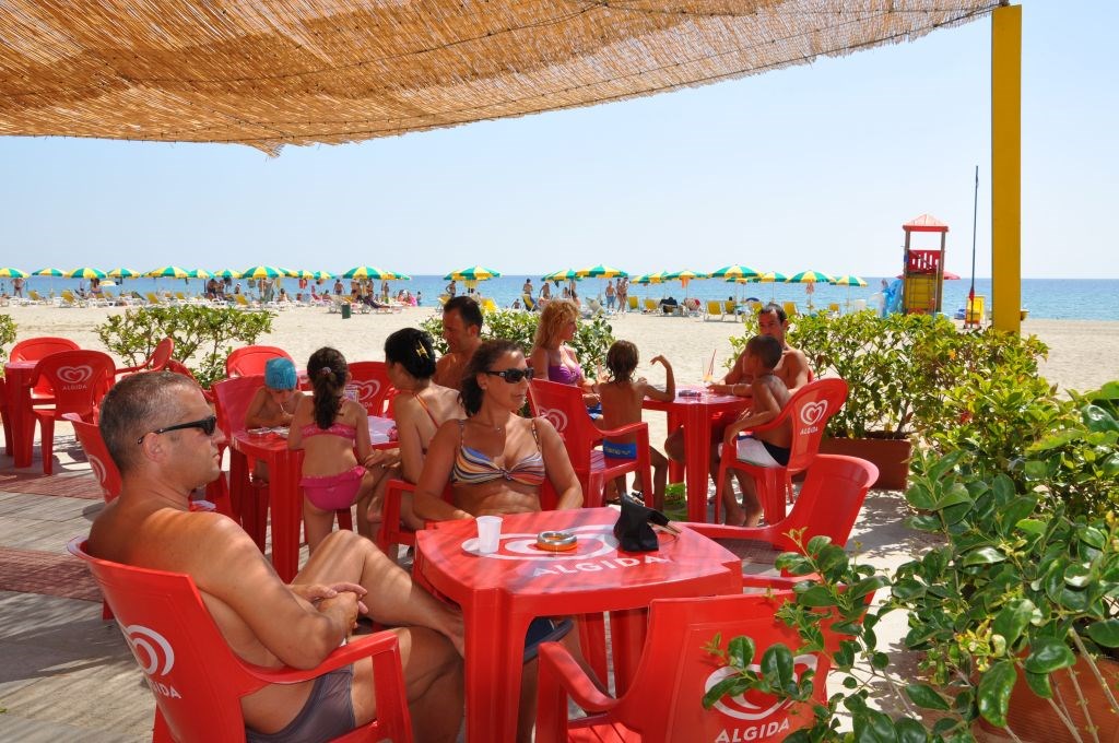 soukrémá pláž s měkkým pískem a pozvolným vstupem do moře cca 150 m, lehátka a slunečníky pro hosty kempu zdarma, plážový bar.
