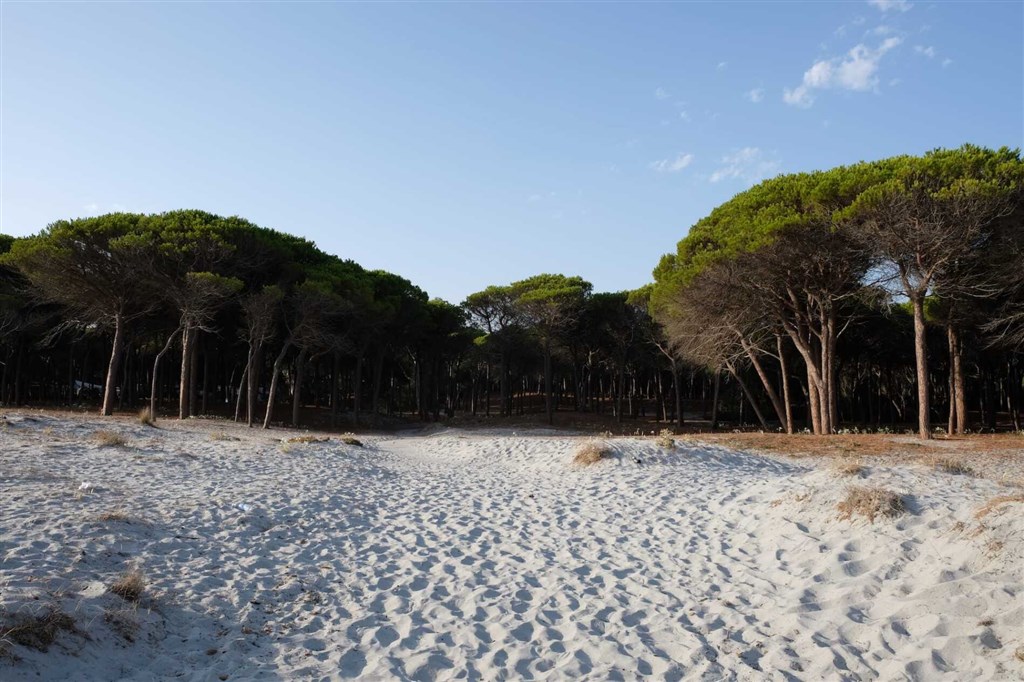 4km dlouhá písečná pláž, přístupná cestou borvou lesem, cca 200 m, lehátka a slunečníky za poplatek