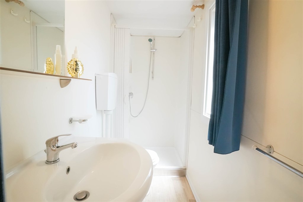 MH 4+2(+1) Superior - 29 m2 - tři ložnice - ložnice s manželskou postelí ( 190x140 cm) a vlastní koupelnou vybavenou umyvadlem, zrcadlem, sprchou a WC, dvě ložnice , každá se dvěma samostatnými lůžky (190x70 cm), denní místnost s posezením, které může sloužit jako lůžko pro 7. osobu. a koupelnou se sprchou, WC, umyvadlem, zrcadlem a fénem. Mobilní domek nabízí maximální pohodlí pro ubytování