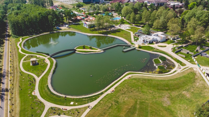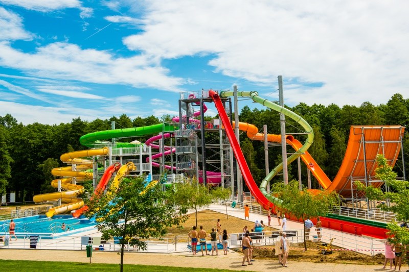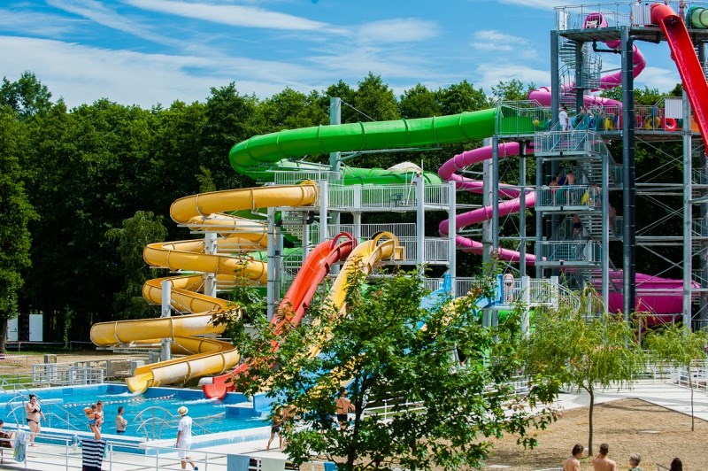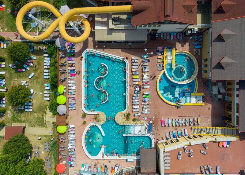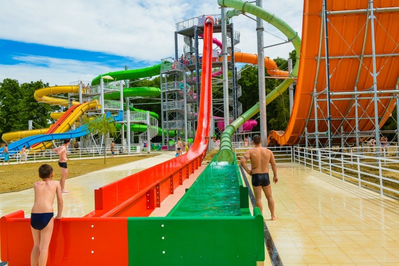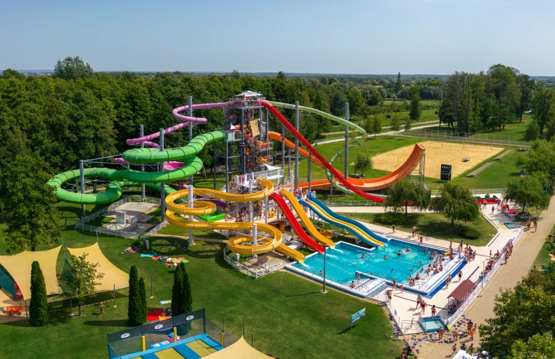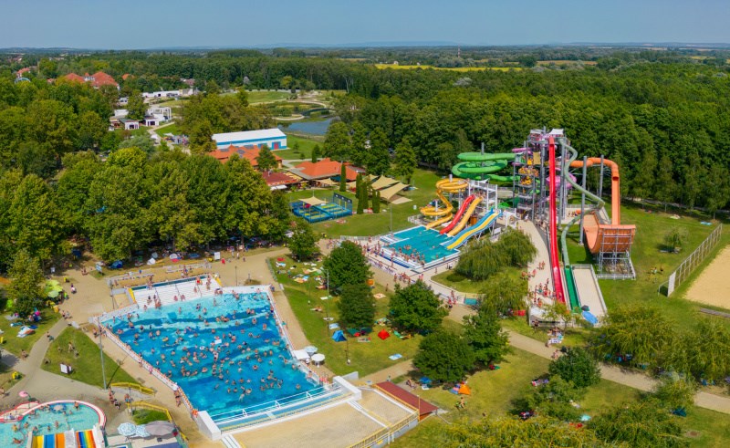 - vnitřní i venkovní termální bazény, léčivé prameny a speciální léčebné postupy, zážitkové bazény, vodní lehátka s perličkovými masážemi, adrenalinový park, divoká řeka, 6 venkovních skluzavek: Anaconda (81 m), kamikaze skluzavky, rodinné skluzavky, divoké vlny (wave pool) o teplotě 28 – 32 °C, vodní stezka pro mladé, fitness bazén