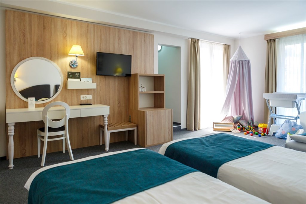 2+2 - F4B, cca 25-31 m2 - rodinný pokoj s balkonem, manželská postel a rozkládací pohovka pro dvě děti do 13 let.