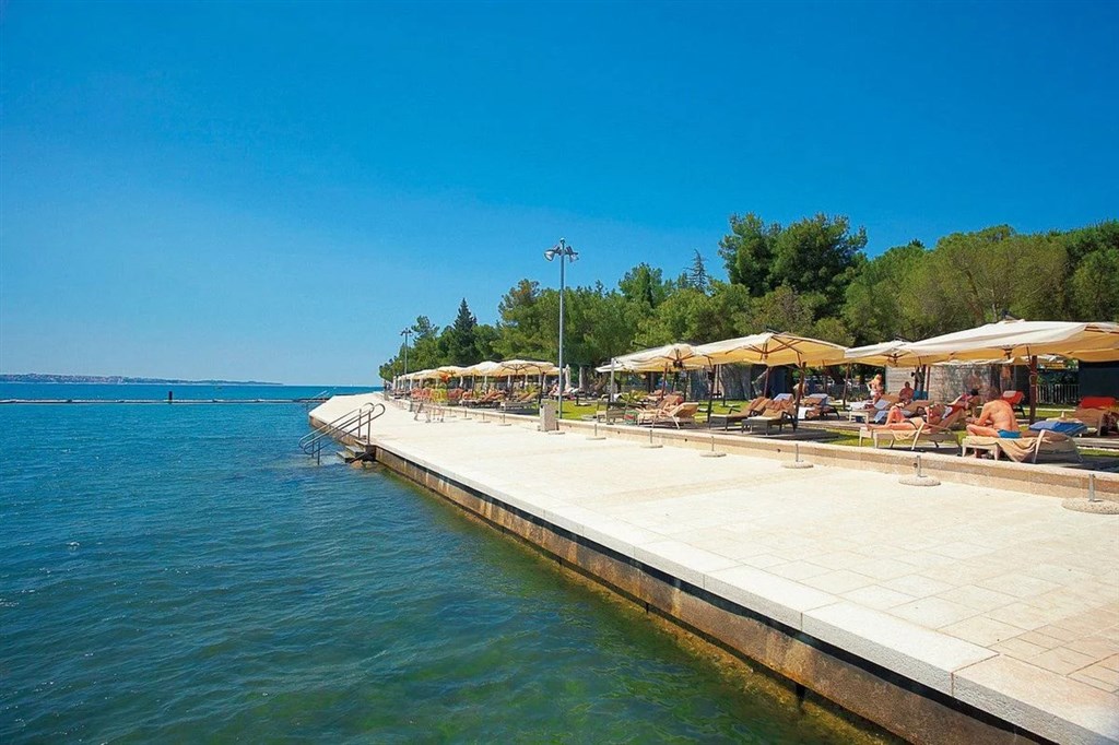 luxusní hotelová pláž s lehátky a slunečníky. Pláž travnatá, betonové či dřevěné plochy. Vzdálenost cca 150 metrů od pláže.