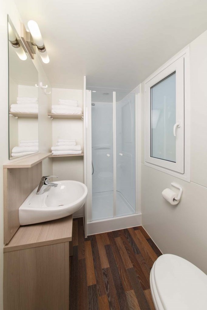 PMP4B2 - MH 4+2 Premium - 32 m2 - 4lůžkový mobilní domek Premium s možností 2 přistýlek pro děti do 12 let s přístupem k bazénu, ložnice s oddělenými lůžky, obývací místnost s rozkládací pohovkou, dětský pokoj s oddělenými lůžky, 2x koupelna se sprchou a WC, vybavený kuchyňský kout, klimatizace, SAT TV, Wi-Fi (bez garance rychlosti připojení), terasa se stolem a židlemi.
